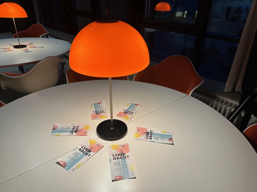 Die 4. Ulmer Lyriknacht wurde gefördert von der Stadt Ulm und der Schweizer Kulturstiftung Pro Helvetia. Sie wurde von Dichter dran e.V. in Kooperation mit der vh Ulm im Rahmen des Ulmer Lyriksommers 2025. organisiert. Die Lyriknacht fand am Freitag, den 24. Oktober 2025 von 19 – 22 Uhr im Club Orange des Einsteinhauses Ulm statt.